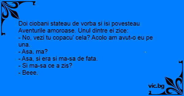 Doi ciobani stateau de vorba si isi povesteau Aventurile amoroase. Unul dintre ei zice:<br />- No, vezi tu copacu' cela? Acolo am avut-o eu pe una.<br />- Asa, ma?<br />- Asa, si era si ma-sa de fata.<br />- Si ma-sa ce a zis?<br />- Beee.