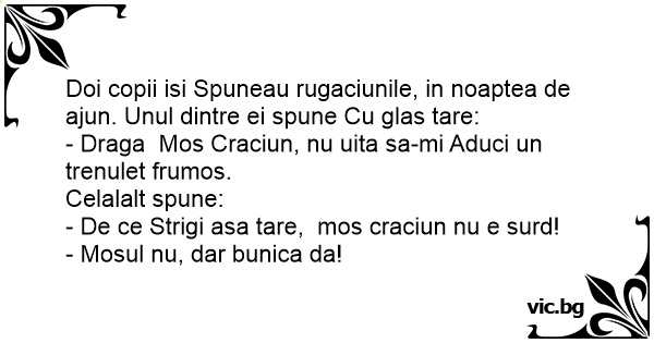 Doi copii isi Spuneau rugaciunile, in noaptea de ajun. Unul dintre ei spune Cu glas tare: