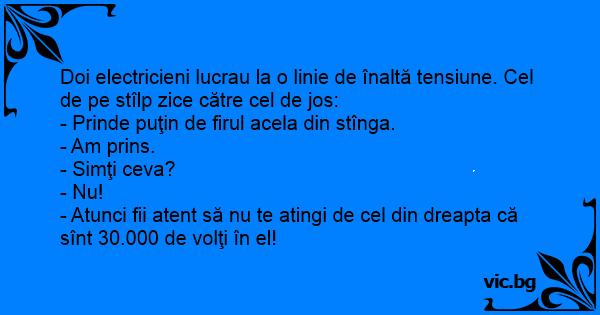 Doi electricieni lucrau la o linie de înaltă tensiune. Cel de pe stîlp zice către cel de jos: