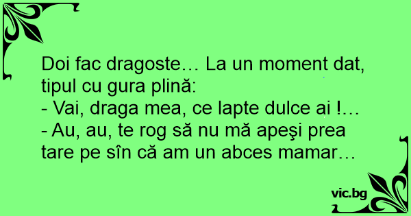- Vai, draga mea, ce lapte dulce ai !… - Au, au, te rog să nu mă apeşi prea tare pe sîn că am un abces mamar…