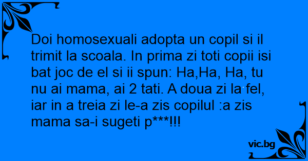 Doi homosexuali adopta un copil si il trimit la scoala. In prima zi toti copii isi bat joc de el si ii spun: Ha,Ha, Ha, tu nu ai mama, ai 2 tati. A doua zi la fel, iar in a treia zi le-a zis copilul :a zis mama sa-i sugeti p***!!!