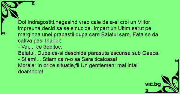 Doi Indragostiti,negasind vreo cale de a-si croi un Viitor impreuna,decid sa se sinucida. Impart un Ultim sarut pe marginea unei prapastii dupa care Baiatul sare. Fata se da cativa pasi Inapoi: