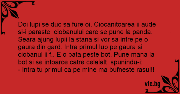 Doi lupi se duc sa fure oi. Ciocanitoarea ii aude si-i paraste ciobanului care se pune la panda. Seara ajung lupii la stana si vor sa intre pe o gaura din gard. Intra primul lup pe gaura si ciobanul ii f.. E o bata peste bot. Pune mana la bot si se intoarce catre celalalt spunindu-i:
