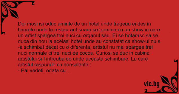 Doi mosi isi aduc aminte de un hotel unde trageau ei des in tinerete unde la restaurant seara se termina cu un show in care un artist spargea trei nuci cu organul sau. Ei se hotarasc sa se duca din nou la acelasi hotel unde au constatat ca show-ul nu s-a schimbat decat cu o diferenta, artistul nu mai spargea trei nuci normale ci trei nuci de cocos. Curiosi se duc in cabina artistului si-l intreaba de unde aceasta schimbare. La care artistul raspunde cu nonsalanta :