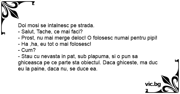 - Stau cu nevasta in pat, sub plapuma, si o pun sa ghiceasca pe ce parte sta obiectul. Daca ghiceste, ma duc eu la paine, daca nu, se duce ea.