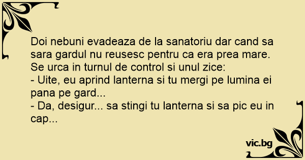 Doi nebuni evadeaza de la sanatoriu dar cand sa sara gardul nu reusesc pentru ca era prea mare. Se urca in turnul de control si unul zice: