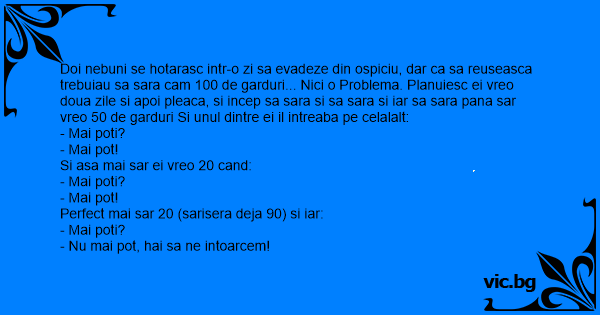 Doi nebuni se hotarasc intr-o zi sa evadeze din ospiciu, dar ca sa reuseasca trebuiau sa sara cam 100 de garduri... Nici o Problema. Planuiesc ei vreo doua zile si apoi pleaca, si incep sa sara si sa sara si iar sa sara pana sar vreo 50 de garduri Si unul dintre ei il intreaba pe celalalt: