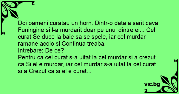 Doi oameni curatau un horn. Dintr-o data a sarit ceva Funingine si l-a murdarit doar pe unul dintre ei... Cel curat Se duce la baie sa se spele, iar cel murdar ramane acolo si Continua treaba.