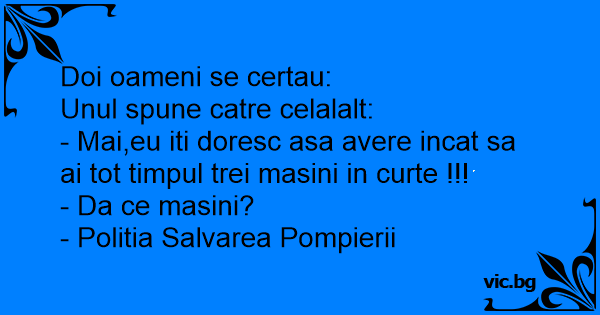 - Mai,eu iti doresc asa avere incat sa ai tot timpul trei masini in curte !!!