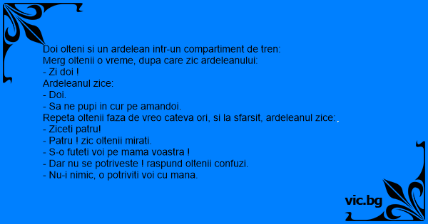 Repeta oltenii faza de vreo cateva ori, si la sfarsit, ardeleanul zice: