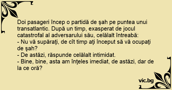 Doi pasageri încep o partidă de şah pe puntea unui transatlantic. După un timp, exasperat de jocul catastrofal al adversarului său, celălalt întreabă: