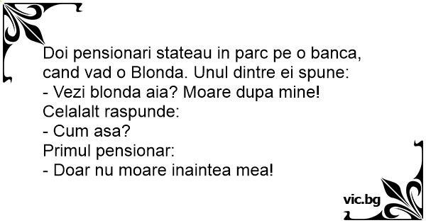 Doi pensionari stateau in parc pe o banca, cand vad o Blonda. Unul dintre ei spune: