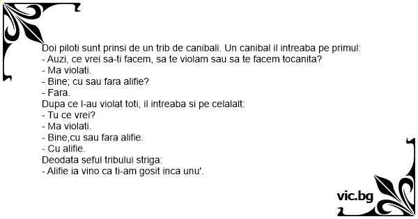 Doi piloti sunt prinsi de un trib de canibali. Un canibal il intreaba pe primul: