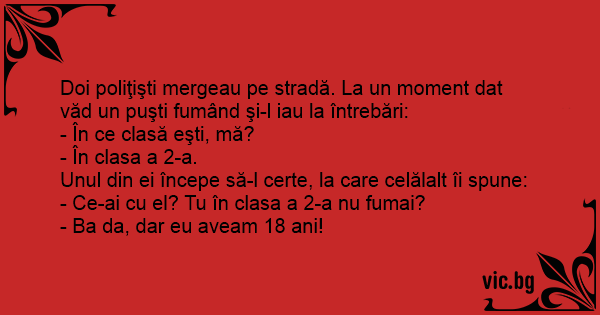 Doi poliţişti mergeau pe stradă. La un moment dat văd un puşti fumând şi-l iau la întrebări: