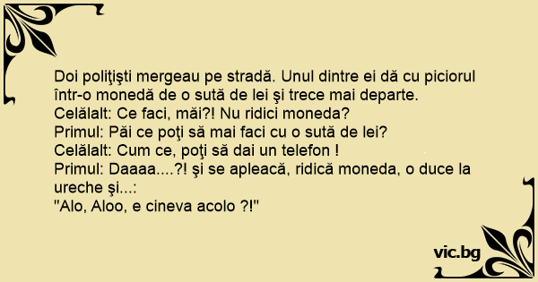 Doi poliţişti mergeau pe stradă. Unul dintre ei dă cu piciorul într-o monedă de o sută de lei şi trece mai departe.