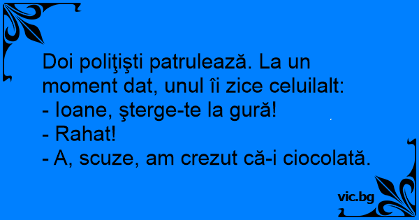 Doi poliţişti patrulează. La un moment dat, unul îi zice celuilalt: