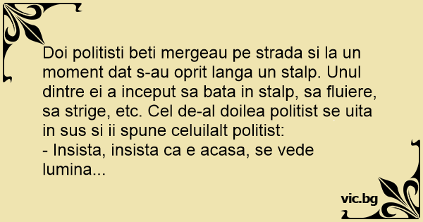 Doi politisti beti mergeau pe strada si la un moment dat s-au oprit langa un stalp. Unul dintre ei a inceput sa bata in stalp, sa fluiere, sa strige, etc. Cel de-al doilea politist se uita in sus si ii spune celuilalt politist: