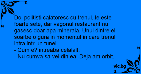 Doi politisti calatoresc cu trenul. le este foarte sete, dar vagonul restaurant nu gasesc doar apa minerala. Unul dintre ei soarbe o gura in momentul in care trenul intra intr-un tunel.