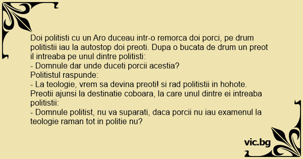- Domnule politist, nu va suparati, daca porcii nu iau examenul la teologie raman tot in politie nu?