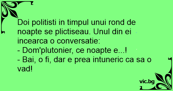 Doi politisti in timpul unui rond de noapte se plictiseau. Unul din ei incearca o conversatie: