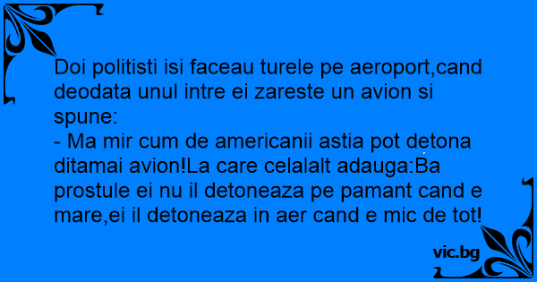 - Ma mir сuм de americanii astia рот detona ditamai avion!La care celalalt adauga:Ba prostule ei nu il detoneaza pe pamant cand e mare,ei il detoneaza in aer cand e mic de tot!