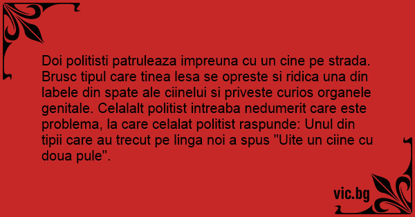 Doi politisti patruleaza impreuna cu un cine pe strada. Brusc tipul care tinea lesa se opreste si ridica una din labele din spate ale ciinelui si priveste curios organele genitale. Celalalt politist intreaba nedumerit care este problema, la care celalat politist raspunde: Unul din tipii care au trecut pe linga noi a spus "Uite un ciine cu doua pule".