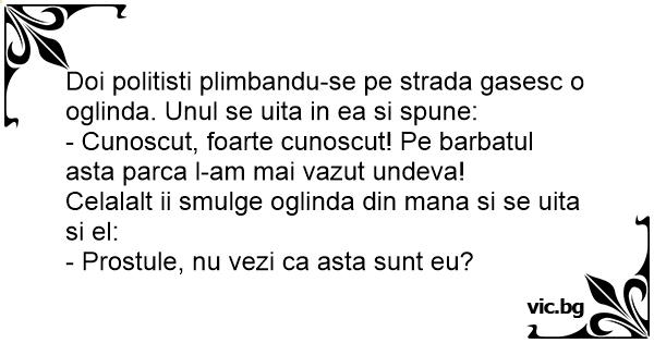 Doi politisti plimbandu-se pe strada gasesc o oglinda. Unul se uita in ea si spune: