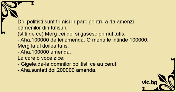 - Aha,100000 de lei amenda. O mana le intinde 100000. Merg la al doilea tufis.