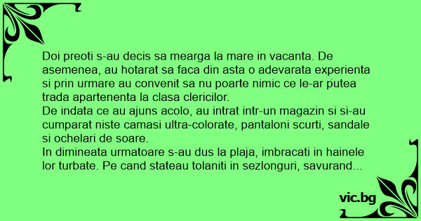 Doi preoti s-au decis sa mearga la mare in vacanta. De asemenea, au hotarat sa faca din asta o adevarata experienta si prin urmare au convenit sa nu poarte nimic ce le-ar putea trada apartenenta la clasa clericilor.