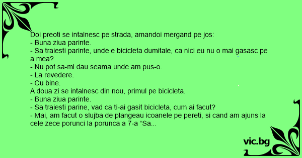 Preotul satului merge la politia din localitate si se plinge: - Fiul meu drag, ajuta-ma, mi-au furat bicicleta. Ce sa ma fac? - Ce sa va faceti parinte? Duminica la slujba trebuie sa spuneti cele...