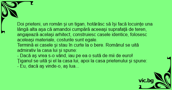 Doi prieteni, un român şi un tigan, hotărăsc să îşi facă locuinţe una lângă alta aşa că amandoi cumpără aceeaşi suprafaţă de teren, angajează acelaşi arhitect, construiesc casele identice, folosesc aceleaşi materiale, costurile sunt egale.