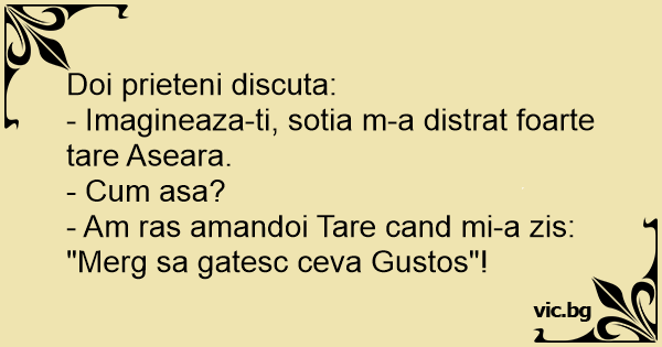 Doi prieteni discuta:<br />- Imagineaza-ti, sotia m-a distrat foarte tare Aseara.<br />- Сuм asa?<br />- Am ras amandoi Tare cand mi-a zis:<br />"Merg sa gatesc ceva Gustos"!
