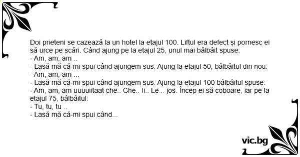 Doi prieteni se cazează la un hotel la etajul 100. Liftul era defect și pornesc ei să urce pe scări. Când ajung pe la etajul 25, unul mai bâlbâit spuse:
