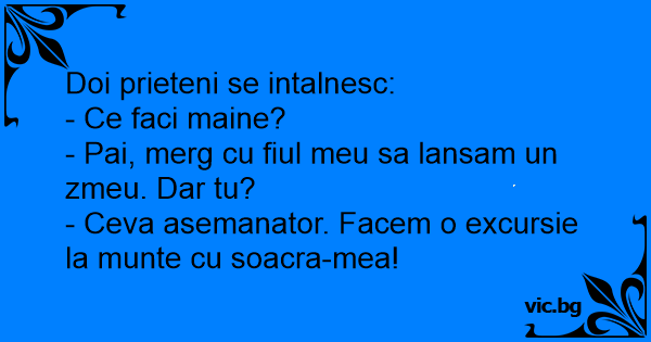 - Hej, co jutro robisz, stary? - Idę z synem za miasto, kupiłem latawiec - będziemy puszczać w powietrze takiego ogromnego smoka! A Ty? - No w sumie prawie to samo - odprowadzam teściową na lotnisko.