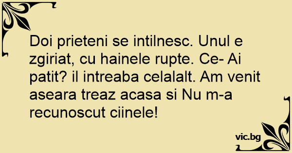 Doi prieteni se intilnesc. Unul e zgiriat, cu hainele rupte. Ce- Ai patit? il intreaba celalalt. Am venit aseara treaz acasa si Nu m-a recunoscut ciinele!