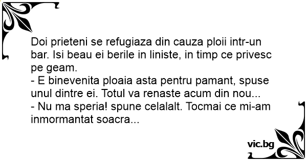 - Nu ma speria! spune celalalt. Tocmai ce mi-am inmormantat soacra...