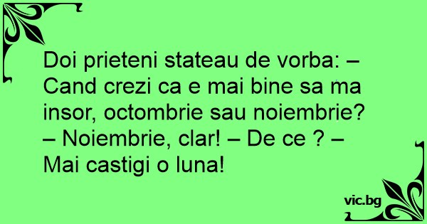Doi prieteni stateau de vorba: – Cand crezi ca e mai bine sa ma insor, octombrie sau noiembrie? – Noiembrie, clar! – De ce ? – Mai castigi o luna!