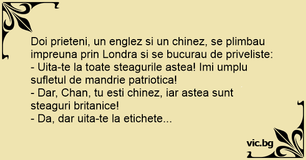 Doi prieteni, un englez si un chinez, se plimbau impreuna prin Londra si se bucurau de priveliste: