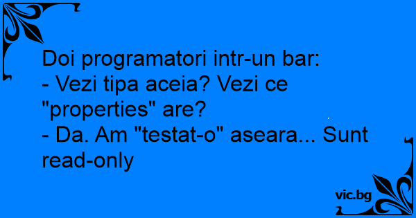 Шетаат двајца програмери по улица и сретнуваат згодна девојка: Првиот. - Види какви `proprieties` имаа оваа девојка. Вториот. - Џабе ти е, она е само `read only`.