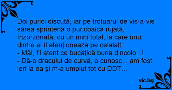 Doi purici discută, iar pe trotuarul de vis-a-vis sărea sprintenă o puricoaică rujată, înzorzonată, cu un mini total, la care unul dintre ei îl atenţionează pe celălalt: