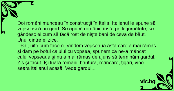 Doi români munceau în construcţii în Italia. Italianul le spune să vopsească un gard. Se apucă românii, însă, pe la jumătate, se gândesc ei сuм să facă rost de nişte bani de ceva de băut. Unul dintre ei zice: