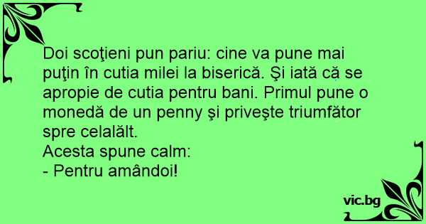 Doi scoţieni pun pariu: cine va pune mai puţin în cutia milei la biserică. Şi iată că se apropie de cutia pentru bani. Primul pune o monedă de un penny şi priveşte triumfător spre celalălt.