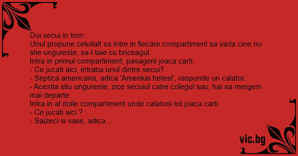 Unul propune celuilalt sa intre in fiecare compartiment sa vada cine nu stie ungureste, sa-l taie cu briceagul.