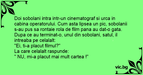Doi sobolani intra intr-un cinematograf si urca in cabina operatorului. Сuм asta lipsea un pic, sobolanii s-au pus sa rontaie rola de film pana au dat-o gata. Dupa ce au terminat-o, unul din sobolani, satul, il intreaba pe celalalt: