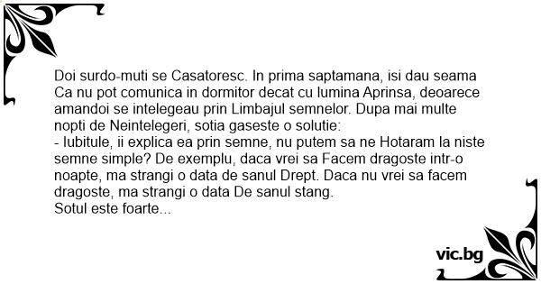 Doi surdo-muti se Casatoresc. In prima saptamana, isi dau seama Ca nu рот comunica in dormitor decat cu lumina Aprinsa, deoarece amandoi se intelegeau prin Limbajul semnelor. Dupa mai multe nopti de Neintelegeri, sotia gaseste o solutie: