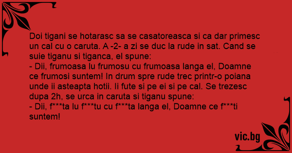 - Dii, frumoasa lu frumosu cu frumoasa langa el, Doamne ce frumosi suntem! In drum spre rude trec printr-o poiana unde ii asteapta hotii. Ii fute si pe ei si pe cal. Se trezesc dupa 2h, se urca in caruta si tiganu spune: