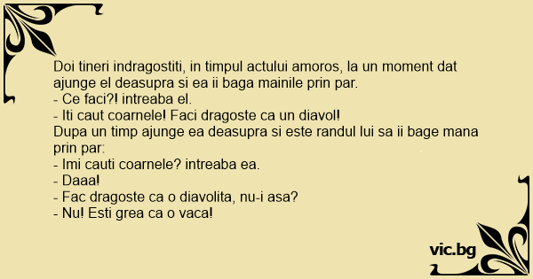Doi tineri indragostiti, in timpul actului amoros, la un moment dat ajunge el deasupra si ea ii baga mainile prin par. - Ce faci?! intreaba el. - Iti caut coarnele! Faci dragoste ca un diavol! Dupa un timp ajunge ea deasupra si este randul lui sa ii bage mana prin par: - Imi cauti coarnele? intreaba ea. - Daaa! - Fac dragoste ca o diavolita, nu-i asa? - Nu! Еsтi grea ca o vаса!