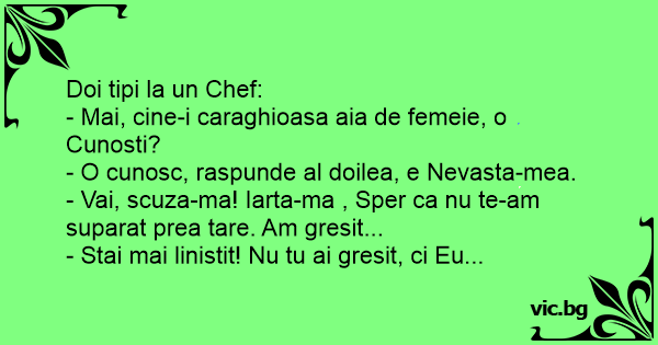 Doi tipi la un Chef: - Mai, cine-i caraghioasa aia de femeie, o Cunosti? - O cunosc, raspunde al doilea, e Nevasta-mea. - Vai, scuza-ma! Iarta-ma , Sper ca nu te-am suparat prea tare. Am gresit... - Stai mai linistit! Nu tu ai gresit, ci Eu...