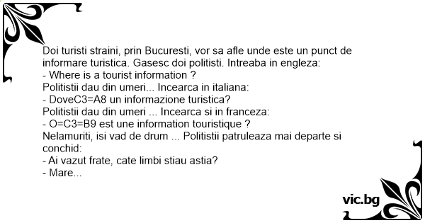 Doi turisti straini, prin Bucuresti, vor sa afle unde este un punct de informare turistica. Gasesc doi politisti. Intreaba in engleza: