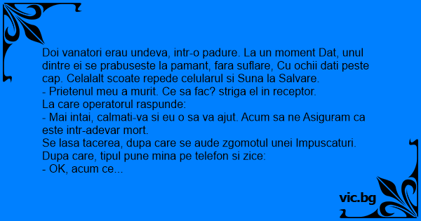 Du medžiotojai eina mišku. Staiga vienas nualpo, ėmė ir nugriuvo. Nekvėpuoja, akys užsimerkė. Kitas medžiotojas telefonu kviečia pagalbą: - Mano draugas negyvas! Ką turiu daryti? - Prašome...